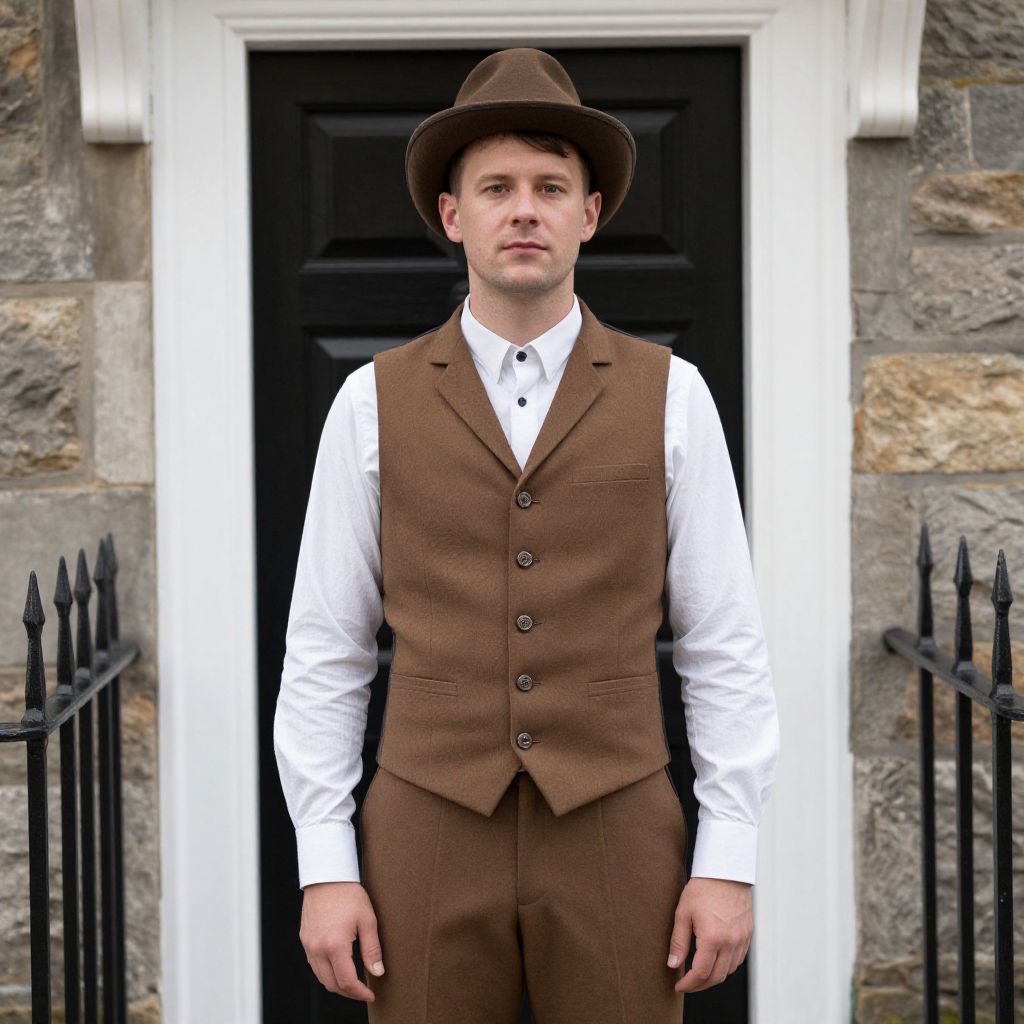 Photograph of a young Caucasian man with fair skin, wearing a brown vest, white shirt, brown trousers, and brown hat, standing in front of