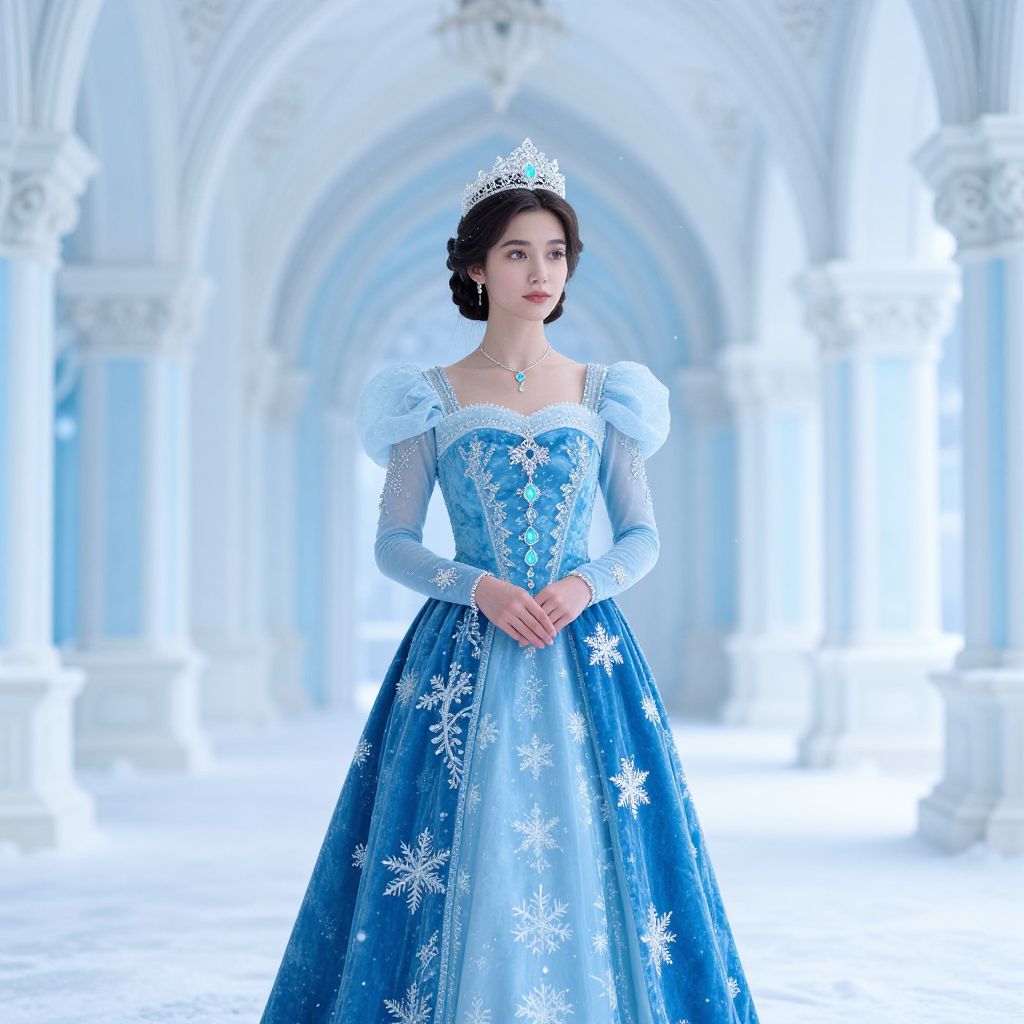 A young woman dressed as an elegant ice queen stands gracefully in a snowy, ornate blue and white palace corridor. She wears a luxurious royal blue velvet gown adorned with intricate snowflake embroidery and sparkling jewelry, complemented by a delicate tiara and a serene expression. The scene evokes a magical, fairytale-like atmosphere with soft falling snow and majestic arched architecture.