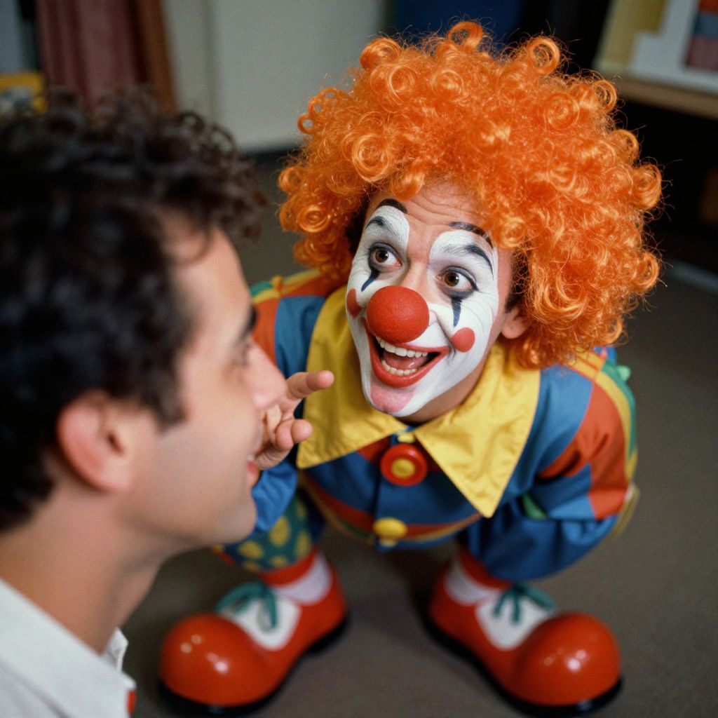 Vibrant, Ektachrome-style photograph of a man dressed as a happy clown, sporting a bright orange wig, red nose, and oversized shoes. Captured in a nostalgic setting reminiscent of the 1970s, with soft focus, film grain texture, and warm lighting. Joyful expression radiates from his face as he interacts with Man has masculine face and piercing eyes
