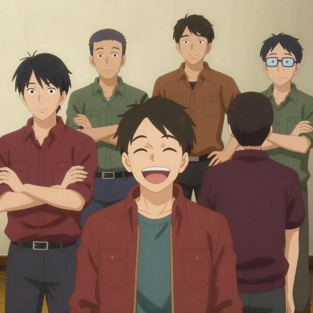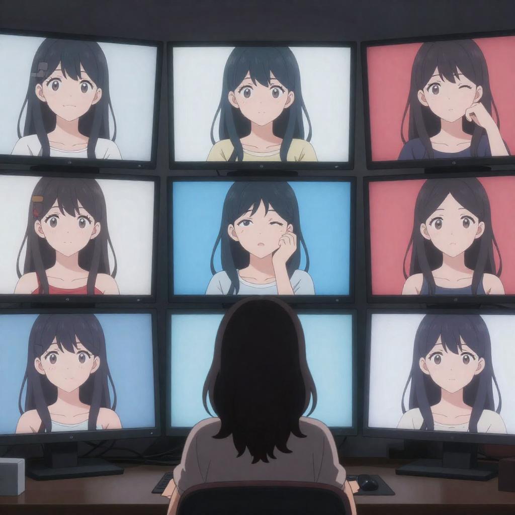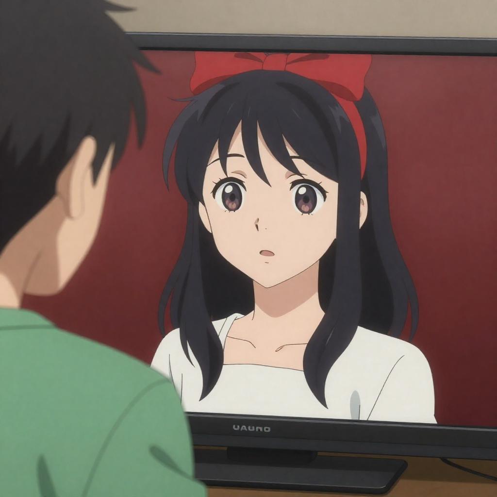Anime scene, black-haired girl with red bow in white dress on TV, green-shirted person with black hair in foreground, red background, TV screen, intense gaze, close-up.