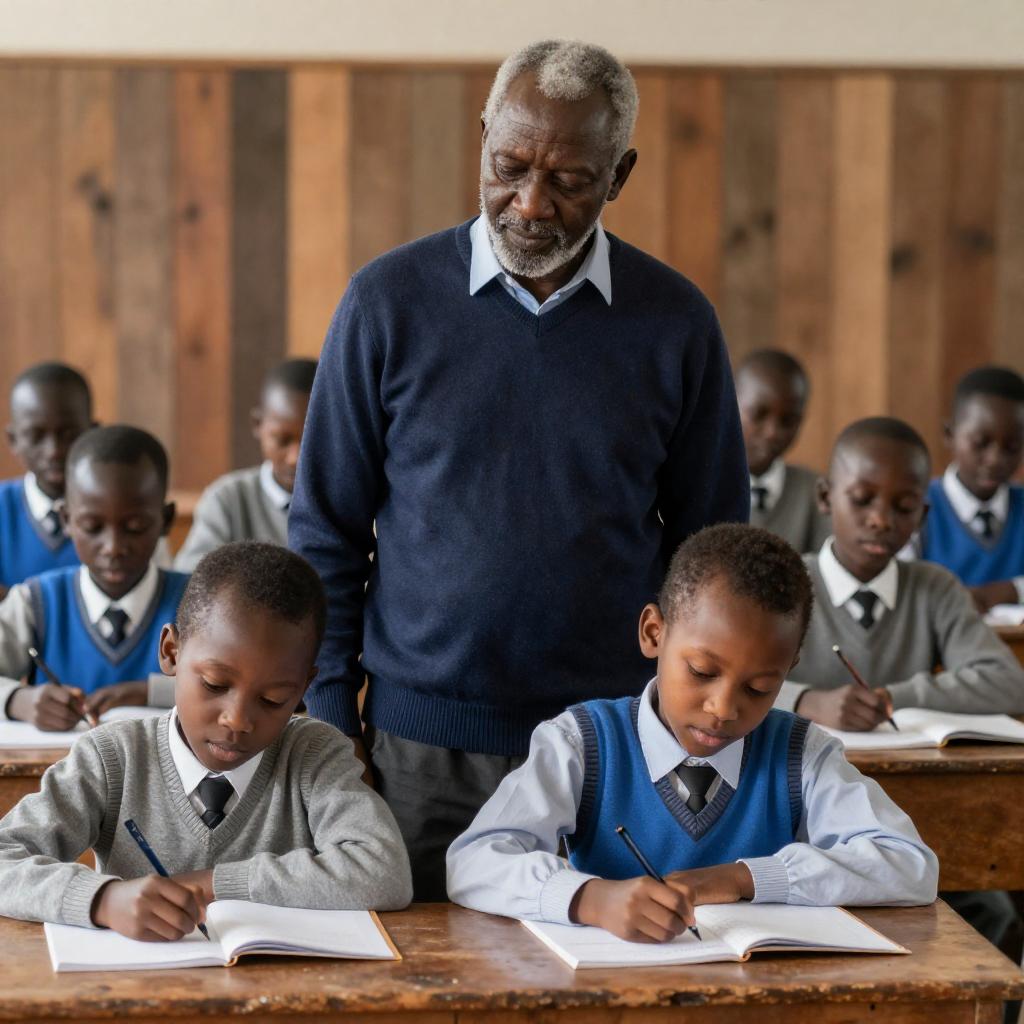 Photograph of an older African man with gray hair and beard, wearing a navy blue sweater, standing in a crowded classroom. Children with short hair, wearing school uniforms with blue vests and gray sweaters, write in notebooks. Wooden desk in front, rustic wooden wall background. Children's expressions are focused and neutral.