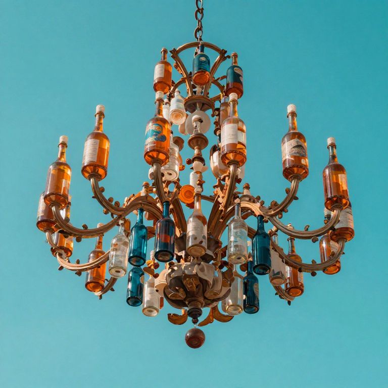 Suspended gracefully against a vibrant teal sky, a fantastical chandelier composed of countless bottles—orange, blue, and white—radiates outward in a branching, organic formation, defying gravity as if powered by ethereal dreams.