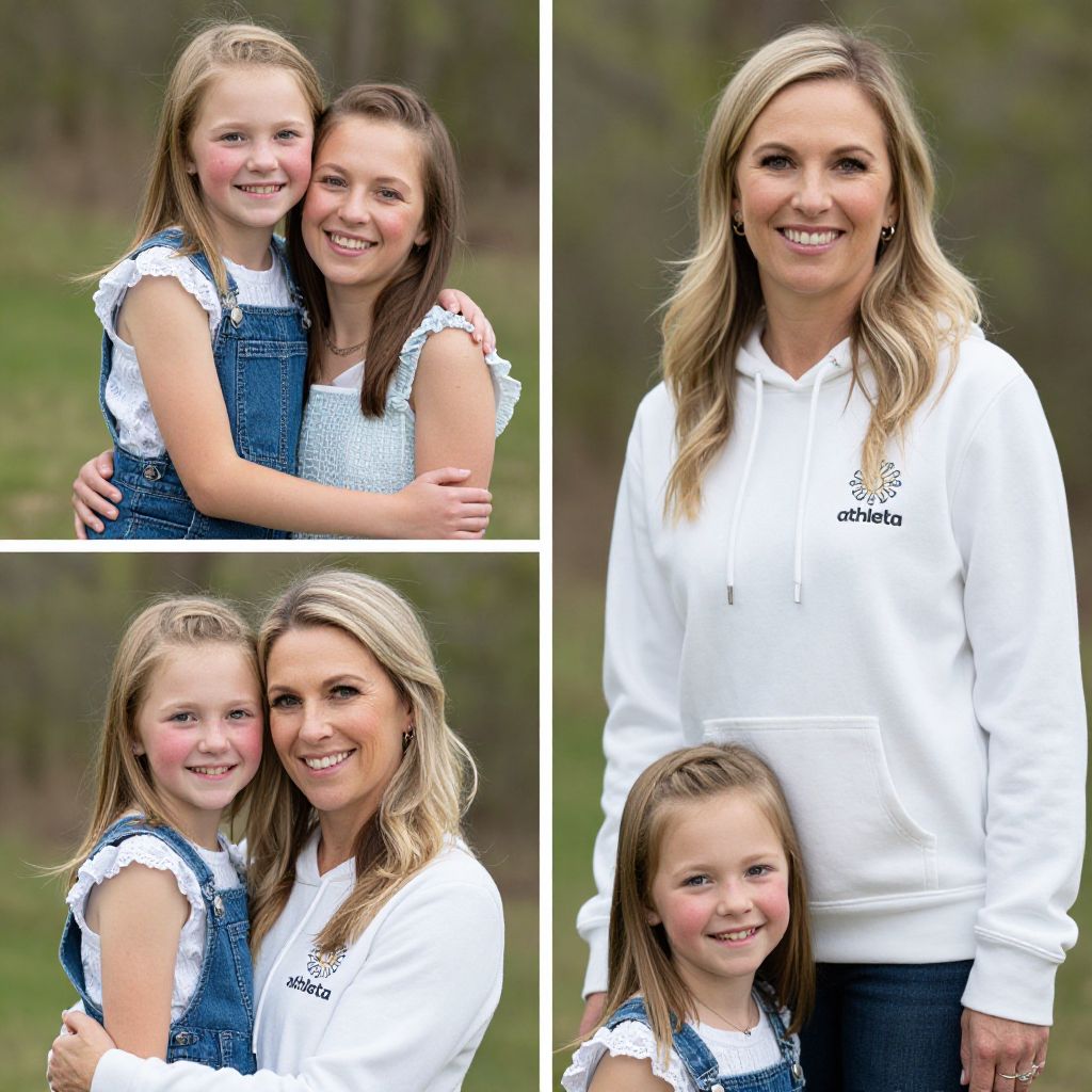 Celebrating Mother's Day outdoors, Ruthie Ridley Blog showcases a joyful collage featuring a woman in a white Athleta hoodie alongside three heartwarming family portraits of a mother and her two daughters, all set against a serene natural backdrop.