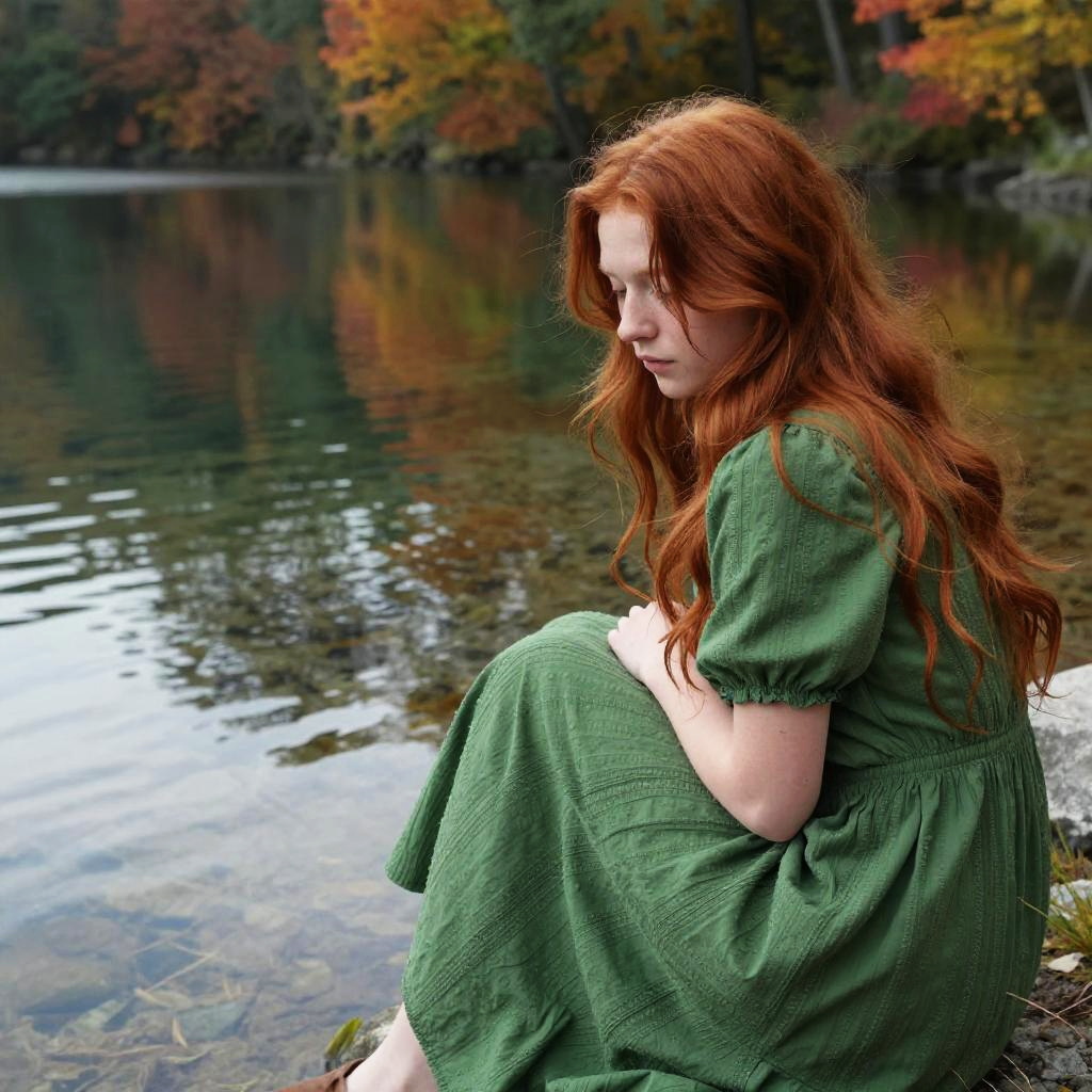 Photograph of a young girl with long, wavy brown hair, wearing a beige, long-sleeved, flowing dress and brown boots, sitting on a wooden bench by a serene lake. The scene is set in autumn, with vibrant orange and red leaves scattered on the ground and floating on the water. The girl is turned slightly to the right, gazing into the distance. The background features a reflection of the colorful foliage on the calm lake's surface, with blurred trees and a soft, golden light enhancing the tranquil atmosphere.