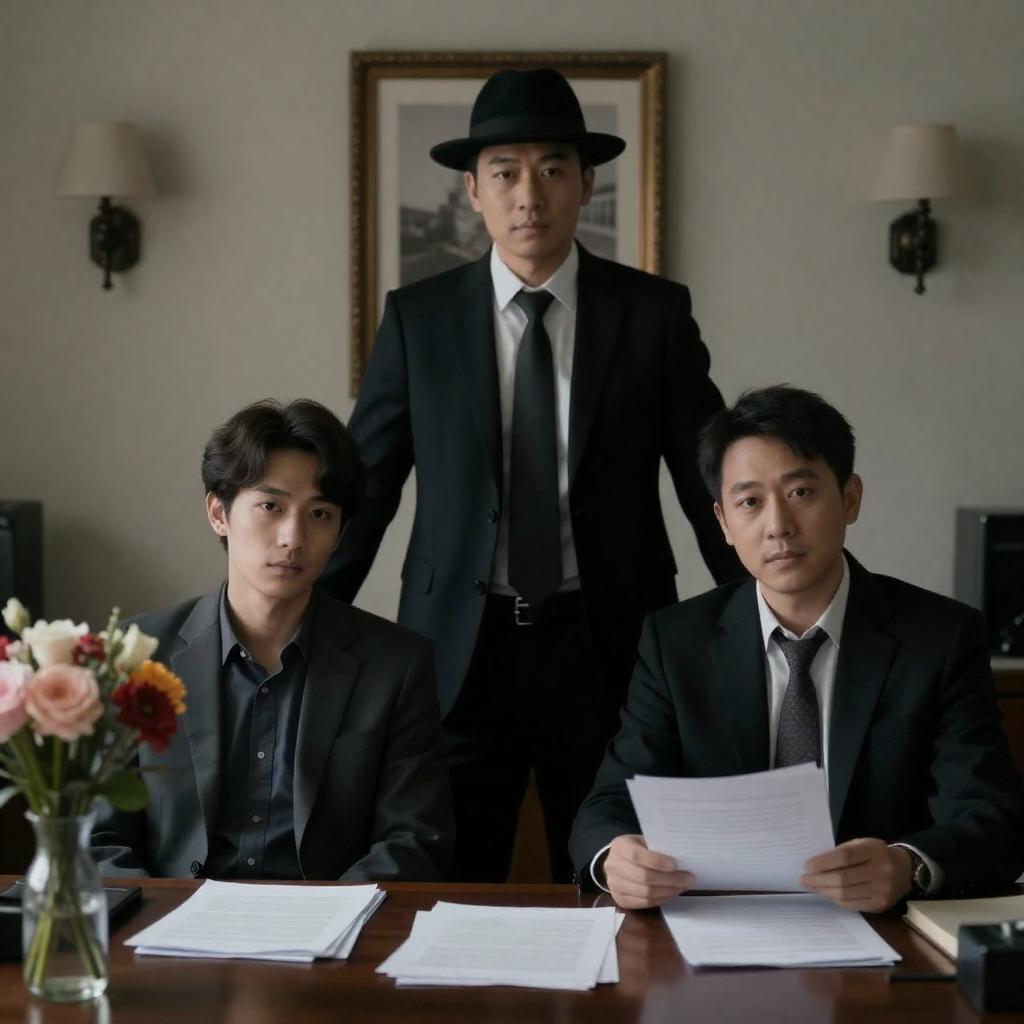Black and white photograph of five people in a studio. Four men in suits and coats stand facing each other, one man with curly hair, one pointing with a gun, others with neutral expressions. One man in white shirt stands in the background holding a camera. Dark curtain backdrop.