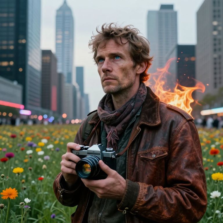 A photorealistic portrait photograph captures a weathered wanderer with piercing blue eyes and an air of mystery. Donning a worn leather jacket and a scarf billowing like flames, they stand at the precipice of a bustling cityscape. The towering skyscrapers pierce the sky, while neon lights cast an ethereal glow on their features. In hand, they hold a vintage camera, its lens capturing a surreal double exposure: urban chaos and serene nature meld into one. Their gaze is fixed on a distant memory—a peaceful meadow filled with vibrant wildflowers that seamlessly blends with the cityscape behind them. This captivating contrast captures the duality of life's experiences.