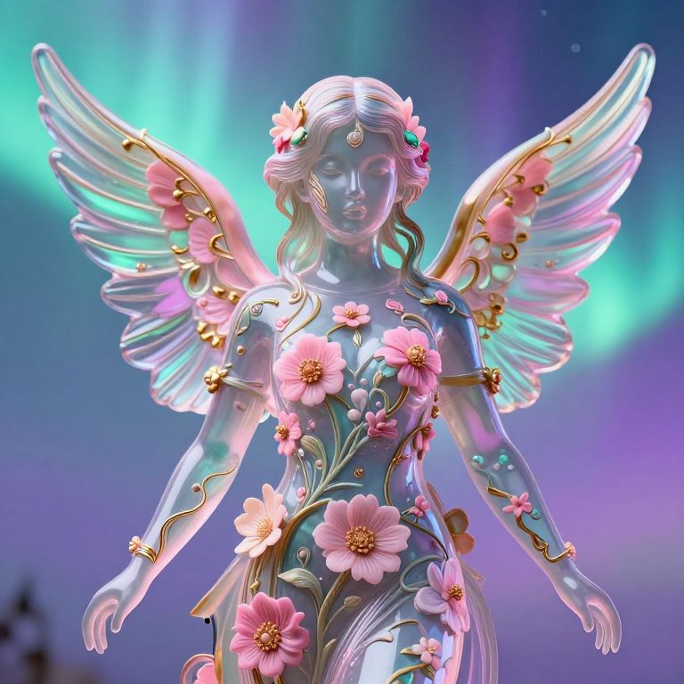 The image presents a stunning representation of a glass female angelic form with a young, beautiful face adorned with ornate patterns on realistic flowers and vines. The figure is depicted in a surreal, ethereal setting with a soft pink, teal, and purple color palette, evoking the Southern lights. The intricate patterns on the flowers and vines are detailed and lifelike, adding a sense of depth and realism to the scene. The figure's wings, with their gold and iridescent hues, are gracefully spread, creating a sense of motion and grace. The overall composition is harmonious, with elements arranged in a balanced manner, creating a visually captivating and serene atmosphere. The Maya render, with its maximum detail and UHD, 32k photorealistic quality, enhances the realism and depth of the image, making it appear almost lifelike. The interplay of colors, textures, and shapes creates a rich and complex visual experience, making the image a true masterpiece of digital art.
