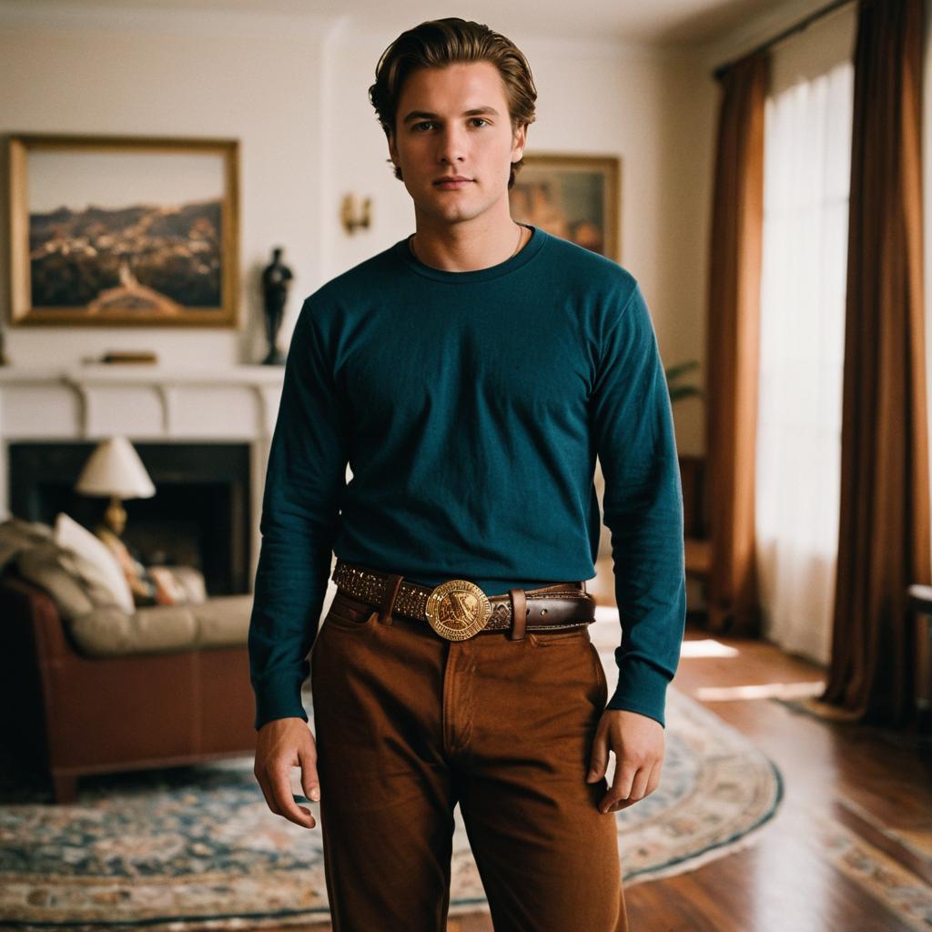 Portrait of a young Caucasian man with light brown hair wearing a dark teal long-sleeve shirt tucked into brown pants with a large decorative belt buckle. He is standing in a well-lit living room featuring a rug, sofa, fireplace, and framed artwork in the background. The atmosphere is warm and cozy with natural light coming through large windows with brown curtains.