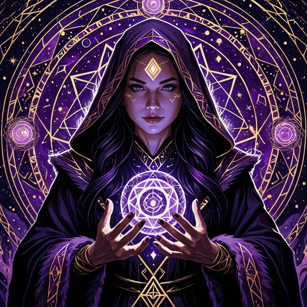 Digital fantasy illustration of an enigmatic sorceress wearing a dark purple and black hooded cloak with fur details. She holds a glowing orb inscribed with magical runes, surrounded by intricate golden celestial symbols and runes. The sorceress has an intense, mystical gaze with glowing eyes, set against a cosmic, kaleidoscopic purple background, emphasizing a mysterious and otherworldly atmosphere.