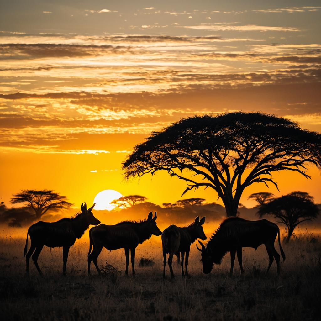 Open savannah with acacia trees and distant hills, huge moon in the sky, group of wildlife photographers watching animals, dramatic cloudscape, photorealistic, volumetric lighting, 8k
