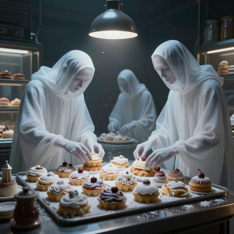 In a hauntingly surreal digital art rendering, ethereal figures draped in ghostly white cloaks deftly prepare pastries in a dimly lit bakery, blending the eerie ambiance of cyberpunk aesthetics with the meticulous craft of pastry-making, where sorrow transforms into sweetness through the alchemy of spectral culinary artistry.
