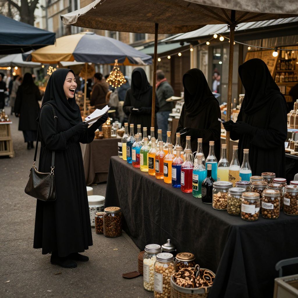 At a surreal marketplace, shadowless merchants trade bottled laughter, liquid dreams, and jars of forgotten childhood memories.