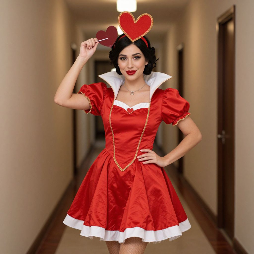 Photograph of a woman in a red, puffed-sleeve, short dress with a white collar and trim, standing in a dimly lit hallway. She has fair skin, dark curly hair, and wears red lipstick. A red heart-shaped headband with a heart-shaped wand is perched on her head. She poses with one hand on her hip and the other holding the wand. The dress has a heart-shaped cutout on the chest and white frills at the hem. The hallway has beige walls, wooden floors, and closed doors on either side. The image has a slight, stylized CGI effect.