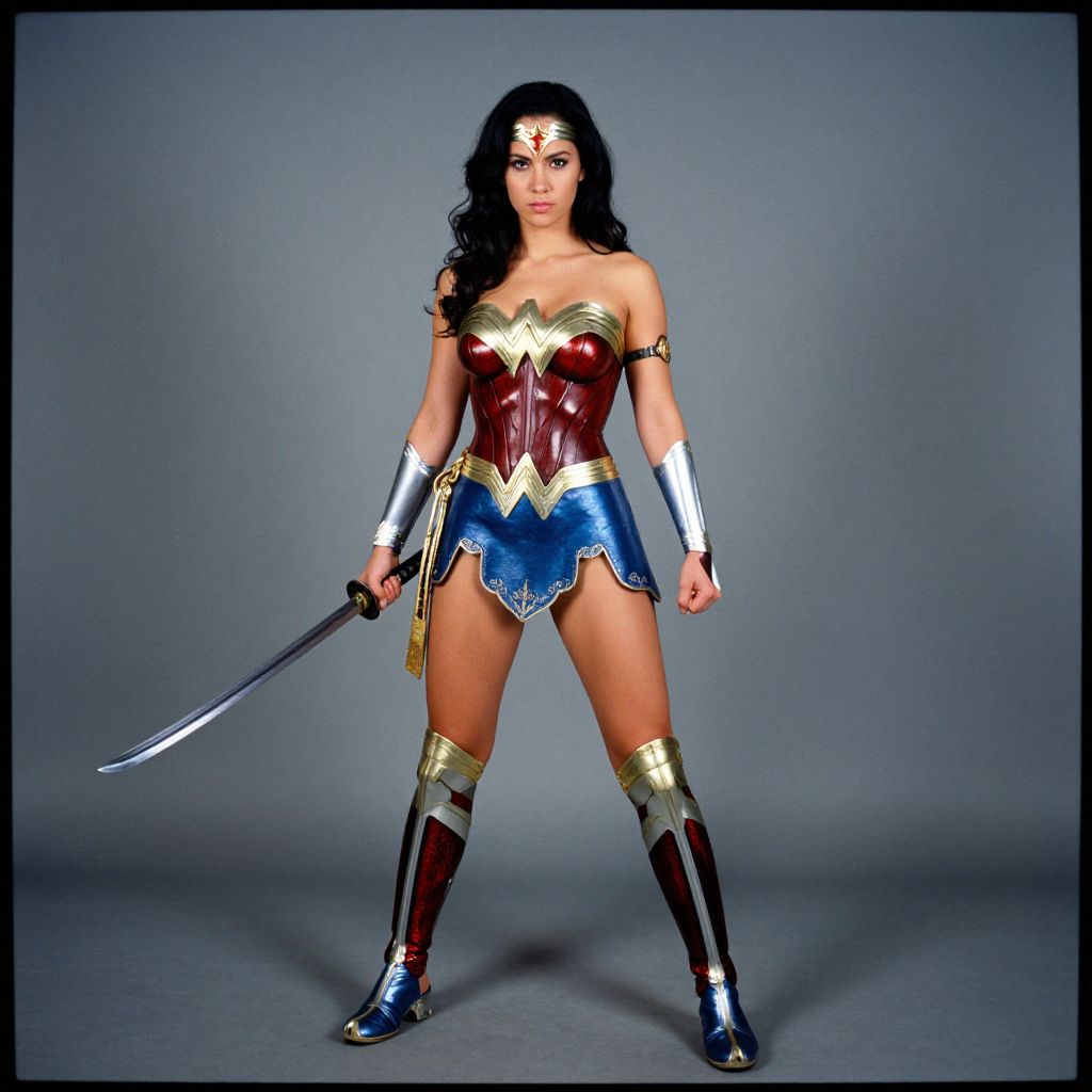 Lomography Wonder Woman hyperrealist photography, Full body shot of a beautiful samurai warrior with a katana,