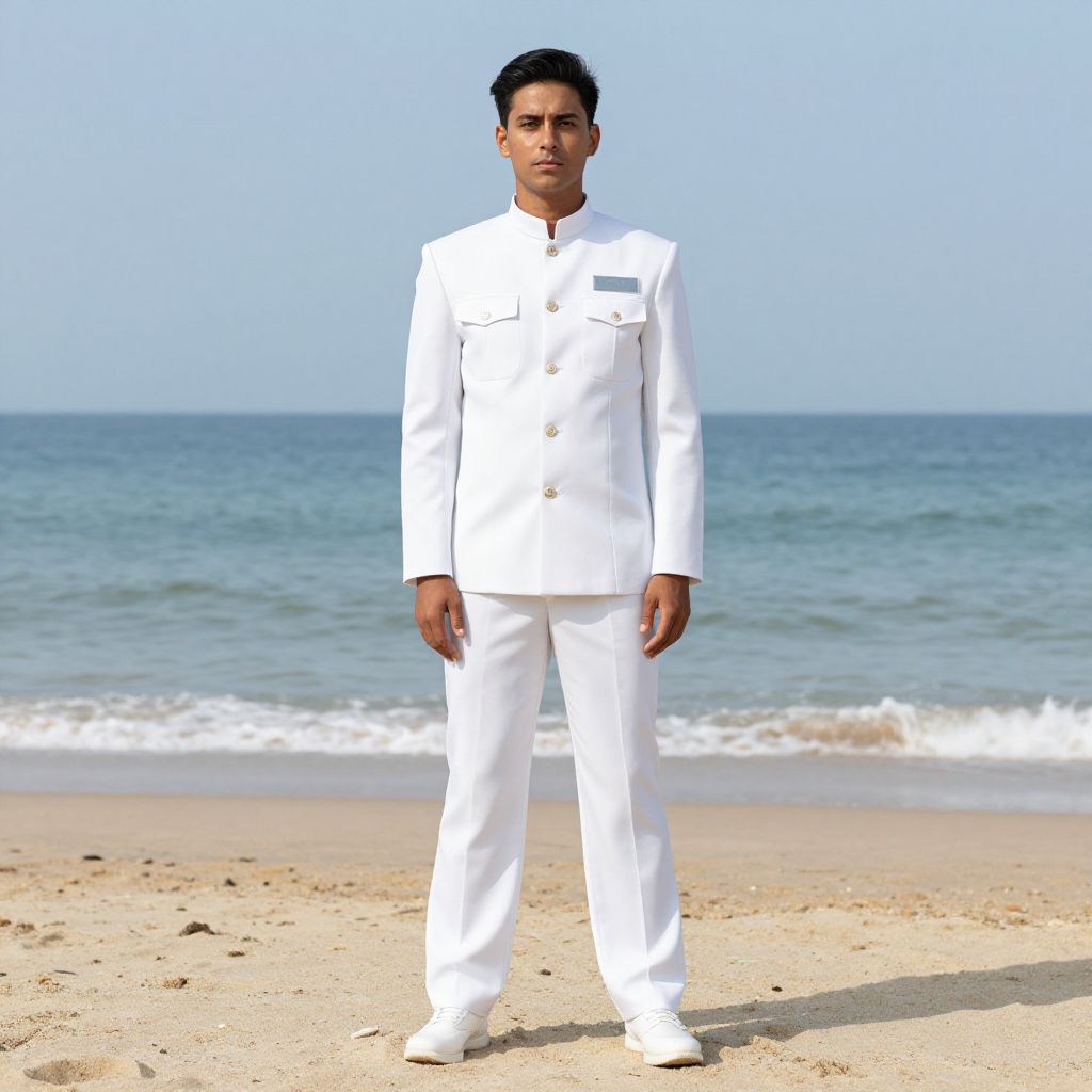 Photograph of a young South Asian man standing on a sandy beach with the ocean in the background. He has short black hair and a medium build. He is wearing a crisp, white naval uniform consisting of a long-sleeved jacket with buttons and matching white pants. His white shoes are neatly polished. The sky is clear and blue, and the ocean has gentle waves. The sand is light beige with a few scattered small rocks. The man stands confidently with his arms relaxed at his sides, facing the camera directly.
