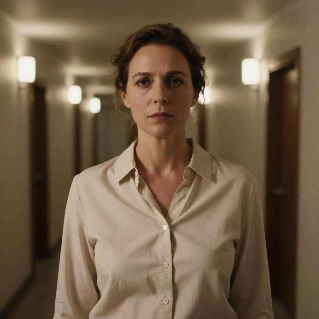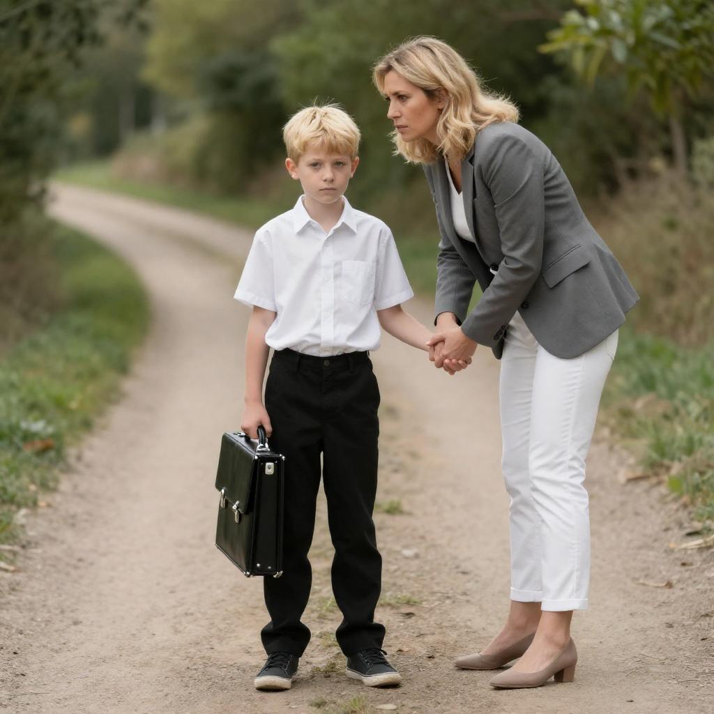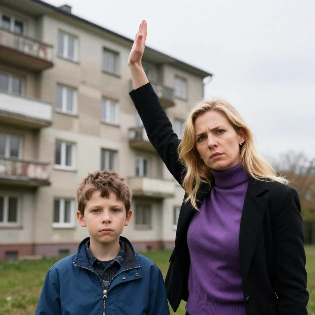 Photograph of a blonde woman and a young boy in front of a worn, multi-story apartment building. Woman with raised arm, intense expression, black jacket, purple turtleneck. Boy with short brown hair, blue jacket, patterned shirt, neutral expression. Grassy foreground, aged building with multiple windows and balconies. Woman on right, boy on left. Woman's hair blowing slightly. Overcast sky in background.