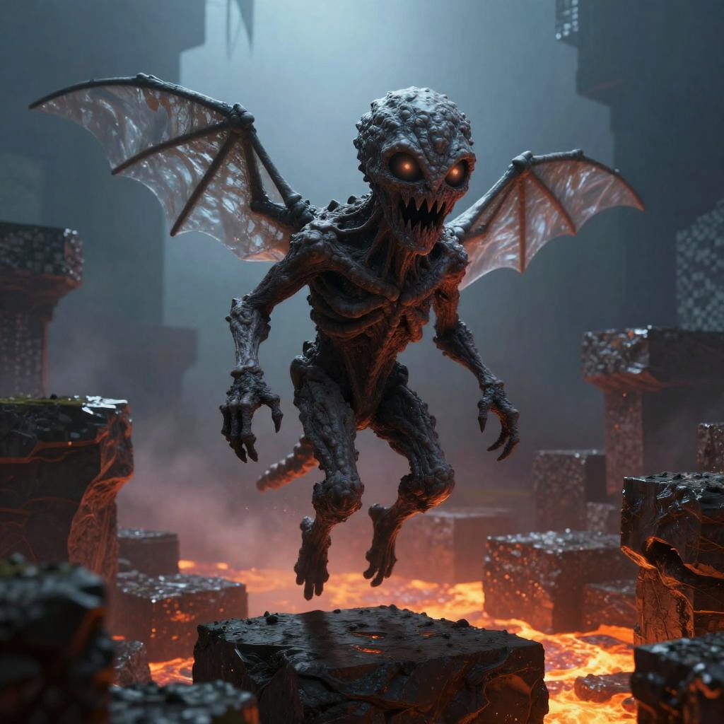 Realistic Minecraft ghast drifting silently in a misty Nether biome, featuring textured, sinewy skin stretched over a cubic form, translucent wings fluttering softly, glowing eyes casting eerie light on surrounding jagged rocks and bubbling lava pits, photorealistic rendering style.