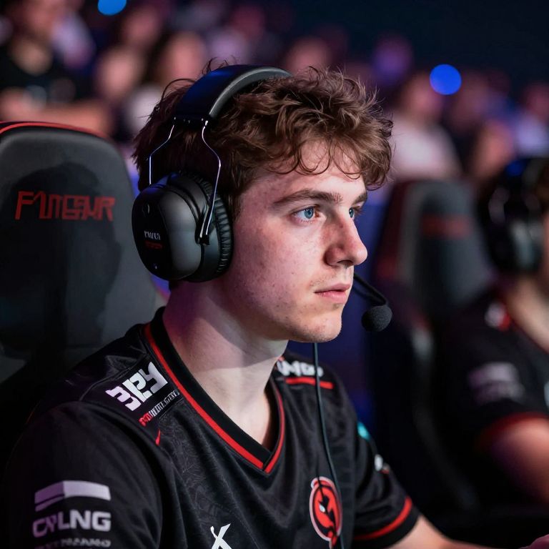 Mibr professional gamer at intense tournament, dramatic spotlight on player, crowd in the background blurred with colorful lights, realistic and expressive facial details, gaming gear and headset, soft shadows, capturing the tension and excitement of esports