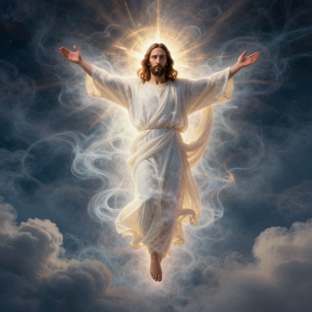 Photorealistic CGI of Jesus Christ with long brown hair, beard, and brown eyes, smiling, hands raised, wearing a white robe with gold trim