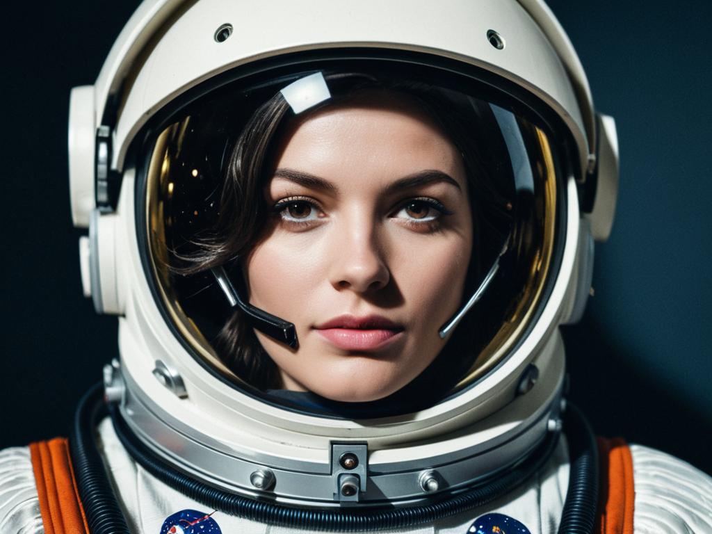 This is a digital photograph of a woman wearing a white space suit with an orange vest and a large, reflective helmet with a clear visor. Her dark brown hair is styled in loose waves, and she has a focused expression with light makeup. A black headset is attached to her helmet. The background is a solid dark gray, which contrasts with her bright space suit. The image has a high-contrast, realistic style with sharp details. The lighting highlights her face and the reflective surface of the helmet.