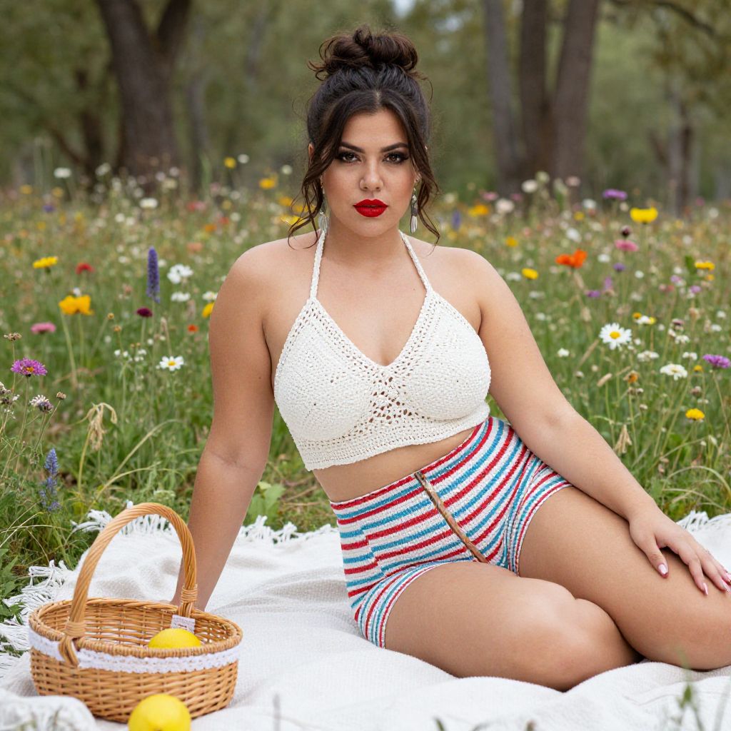 Photograph of a curvy woman with olive skin and dark brown hair in a messy bun, sitting on a white blanket in a colorful meadow. She's wearing a white, crocheted halter top and matching high-waisted shorts with red, blue, and white stripes. She has bold red lipstick and is accessorized with dangling earrings. In the foreground, there's a wicker basket with a lemon. The background is filled with tall trees and blooming flowers.