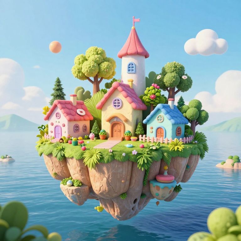 Whimsical CGI island with colorful houses, lush greenery, and a blue sky. Floating above a calm, blue ocean, surrounded by small islands