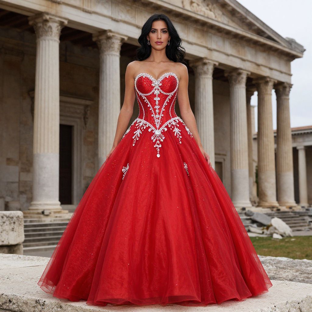 Photograph of a tall, dark-haired woman in an elaborate, strapless red ball gown with a sweetheart neckline and intricate white floral embroidery. The gown's voluminous tulle skirt is adorned with sparkling sequins. She stands confidently in front of an ancient, classical Greek-style building with large, fluted columns and a weathered stone facade. The background includes gray stone steps and scattered rocks. The contrast between the vibrant red of her dress and the muted tones of the ancient architecture creates a striking visual effect. The overall scene combines modern elegance with historical grandeur.