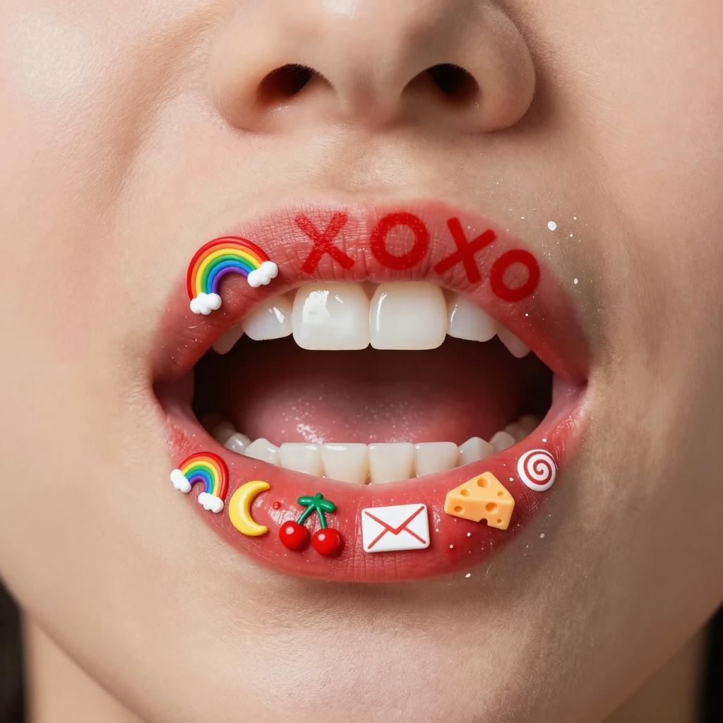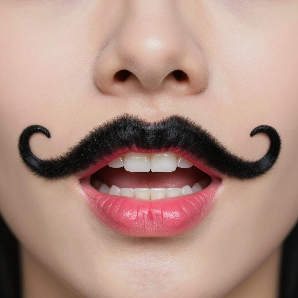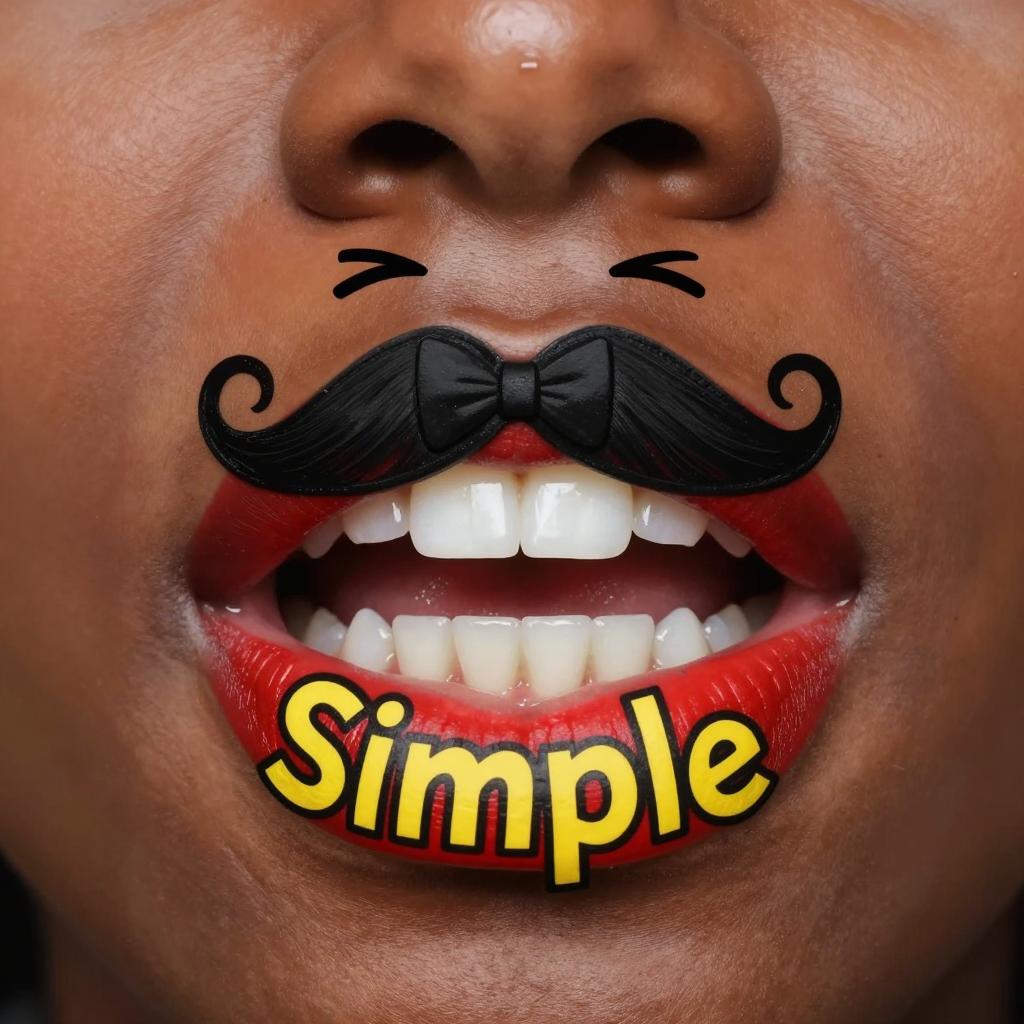 Close-up photograph of a person's lips painted red with a cartoon mustache and bowtie on the upper lip. The word "Simple" in bold yellow and black letters is on the lower lip. White teeth visible. Dark brown skin background. Cartoon mustache has winking eyes and raised eyebrows.