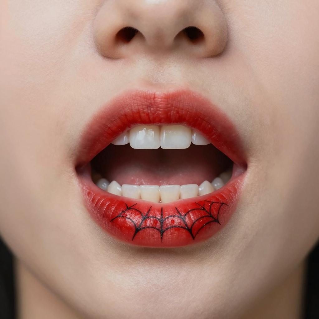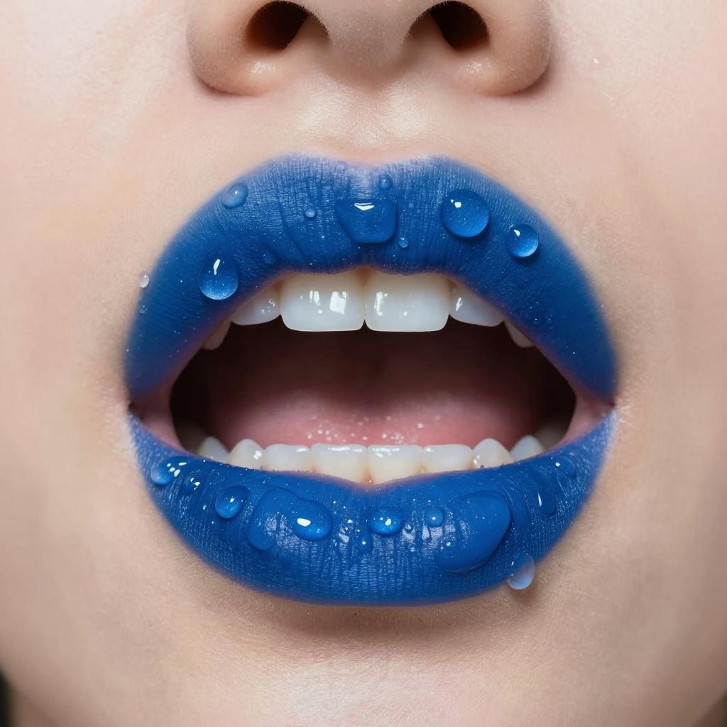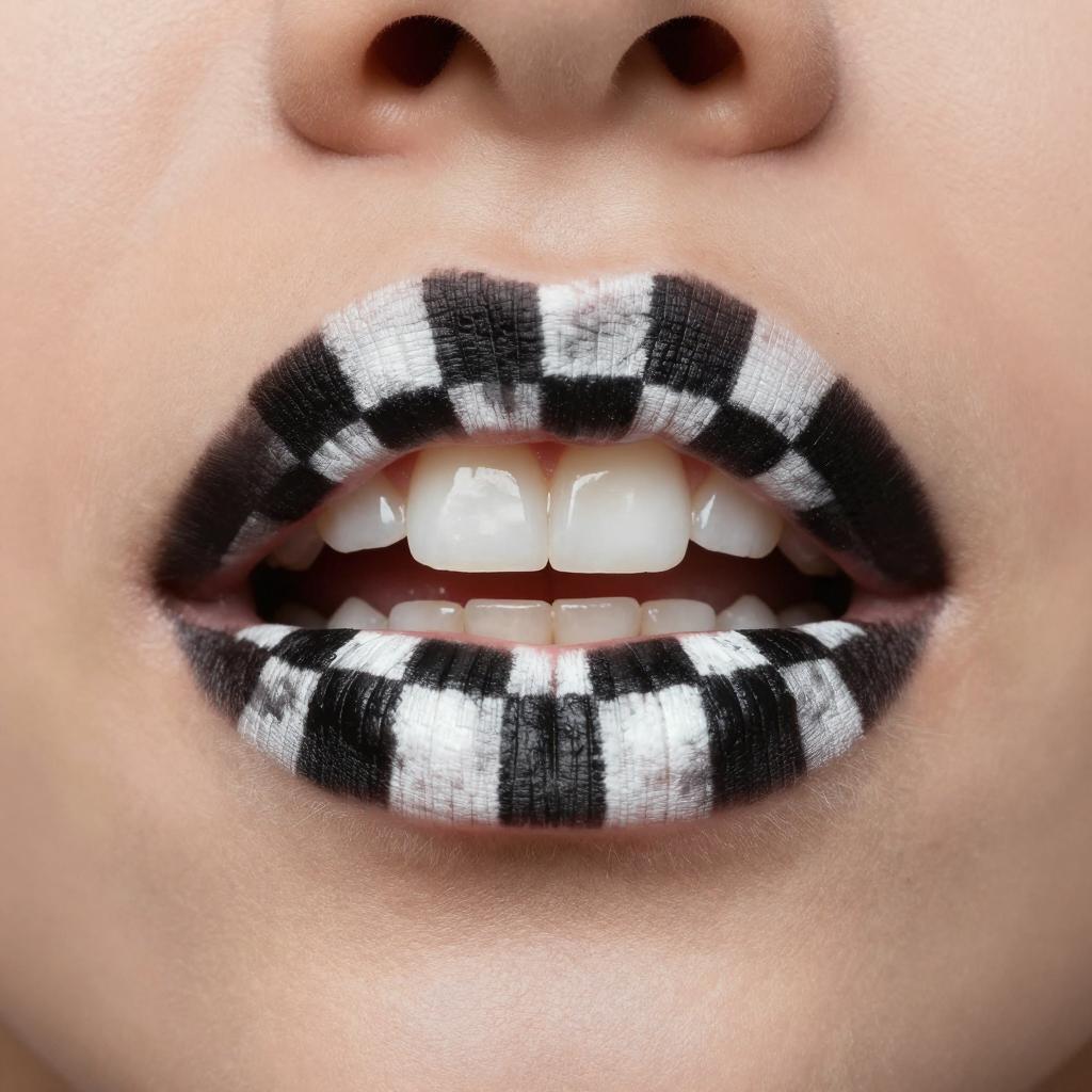 Close-up photograph of a person's lips painted red with a cartoon mustache and bowtie on the upper lip. The word "Simple" in bold yellow and black letters is on the lower lip. White teeth visible. Dark brown skin background. Cartoon mustache has winking eyes and raised eyebrows.