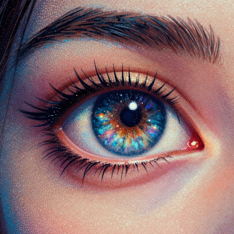 Craft an enchanting digital artwork by merging pointillism's intricate technique with futuristic aesthetics. Depict a close-up of an android eye reflecting a distant starry galaxy, creating a captivating contrast between the artificial iris and lens details against the vibrant celestial backdrop. This innovative image seamlessly blends vintage pointillist artistry with modern digital design, evoking feelings of wonder, intrigue, and technological brilliance in an unforgettable visual masterpiece that captivates the viewer's imagination.