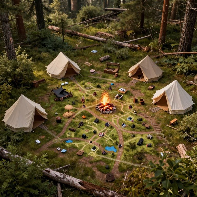 Aerial photograph of a rustic campsite in a dense forest. Four beige canvas tents are arranged in a circle around a central campfire, emitting a bright orange glow. The campsite is on a grassy area with dirt paths, surrounded by tall trees and fallen logs. Various camping gear, including backpacks, sleeping bags, and cooking utensils, are scattered around the tents. Small blue and red tarps are placed near the tents, and a wooden bench is situated to the right. The forest floor is lush with greenery, creating a serene, natural atmosphere.