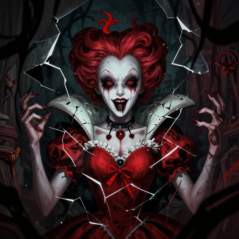 The Queen Of Hearts inside a broken and shattered mind, shadows and chaos, self doubt, depression, misery, shadows and darkness, insane detail, hightly saturated, very detailed,