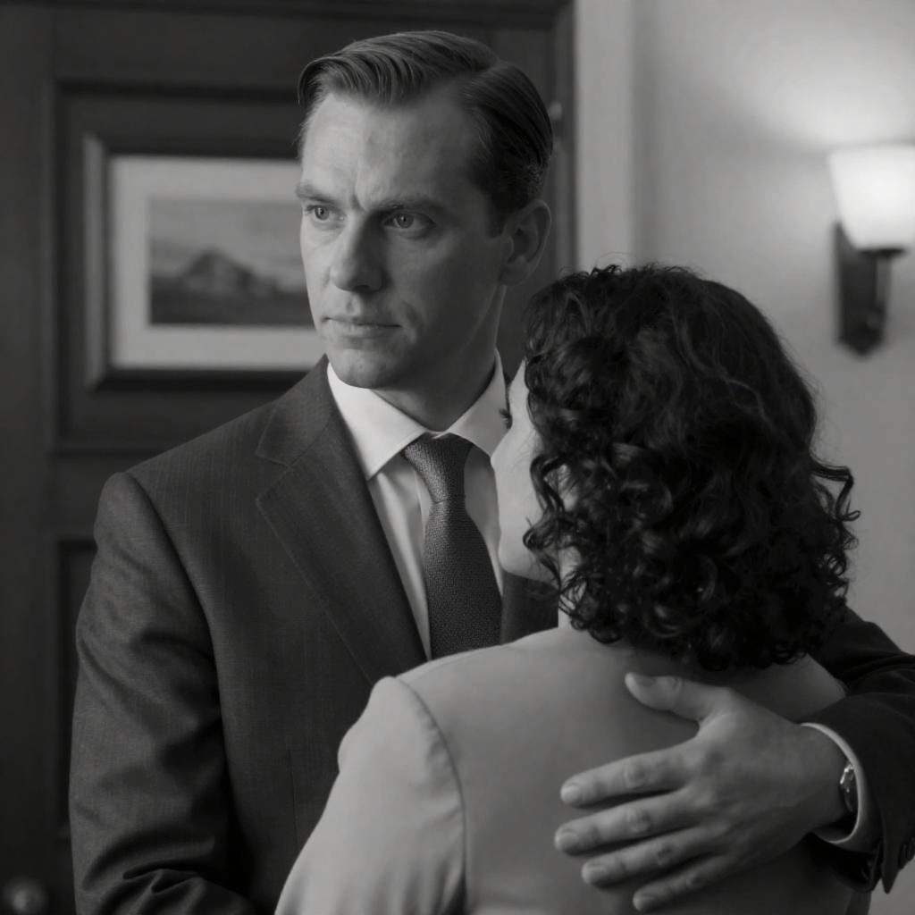 Black-and-white photograph. Man with short dark hair, intense gaze, right foreground. Woman with short blonde hair, back view, left, wearing a long-sleeve top and skirt, standing by a fireplace with a clock and framed picture, mirror reflection. Reflection shows woman looking at the camera. Classic, mid-20th-century style.