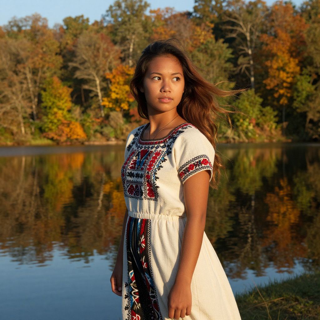 Imagine a photorealistic portrait of a young Micronesian woman captured by a film camera. With deep, soulful eyes, she gazes into the distance, her tanned skin radiant and her wavy chestnut hair dancing gently in the breeze. She stands at the edge of a serene lake, her reflection gazing back at her on the water's surface. The vibrant autumn forest surrounding the lake serves as a breathtaking backdrop, its colors framing her beautifully. She wears an intricately embroidered peasant dress that flutters softly in the wind, the fabric's texture and folds accentuated by the gentle movement. Warm golden hour light filters through the trees, illuminating the scene and casting long shadows across the tranquil landscape. This harmonious blend of nature's beauty and the woman's captivating presence evokes a range of emotions in the viewer, from serene tranquility to profound introspection. The portrait invites viewers to connect with the woman's enigmatic aura as she stands in peaceful harmony with the natural world around her.
