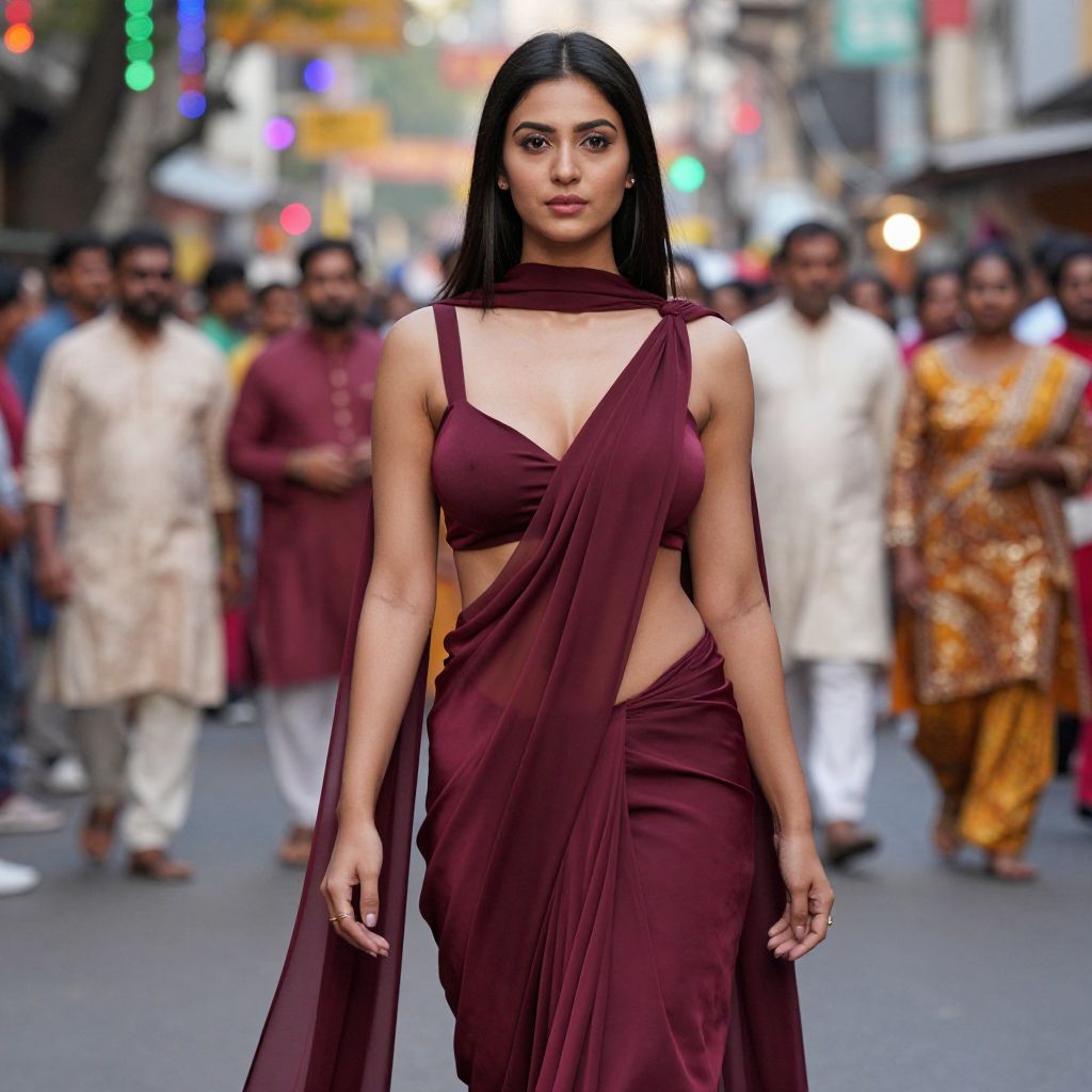 A bold and modern Indian woman with sharp features, dark eyes, and dark straight hair wearing a contemporary crepe silk saree in maroon with a cut-out design and flowing drapes, styled as a costume for a cultural fashion parade in a vibrant city street with people in traditional attire and colorful lights in the background.. The woman has big tits and cute face