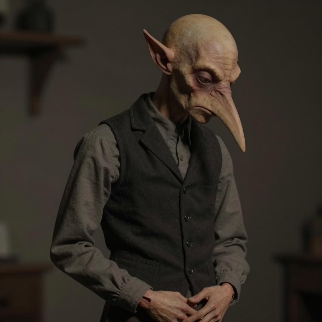 Photograph of a humanoid figure with a bald head, pointed ears, and a grotesque, elongated snout. Wearing a dark, buttoned vest over a long-sleeved shirt. Hands clasped behind back. Low light, shadowy background. Figure's head tilted downward, expression sad.