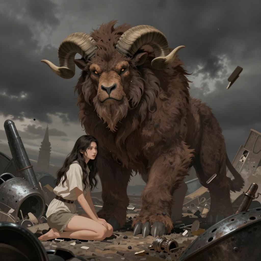 A digital illustration of a brown-furred, large, shaggy-haired beast with curved horns, kneeling beside a crouching woman with long dark hair and light-colored clothing. Surrounding them are scattered, broken, metallic objects and debris. The background has a dark, cloudy sky. The woman looks at the beast with a neutral expression. The beast's intense gaze is directed forward. The scene is chaotic with metallic fragments and wreckage.