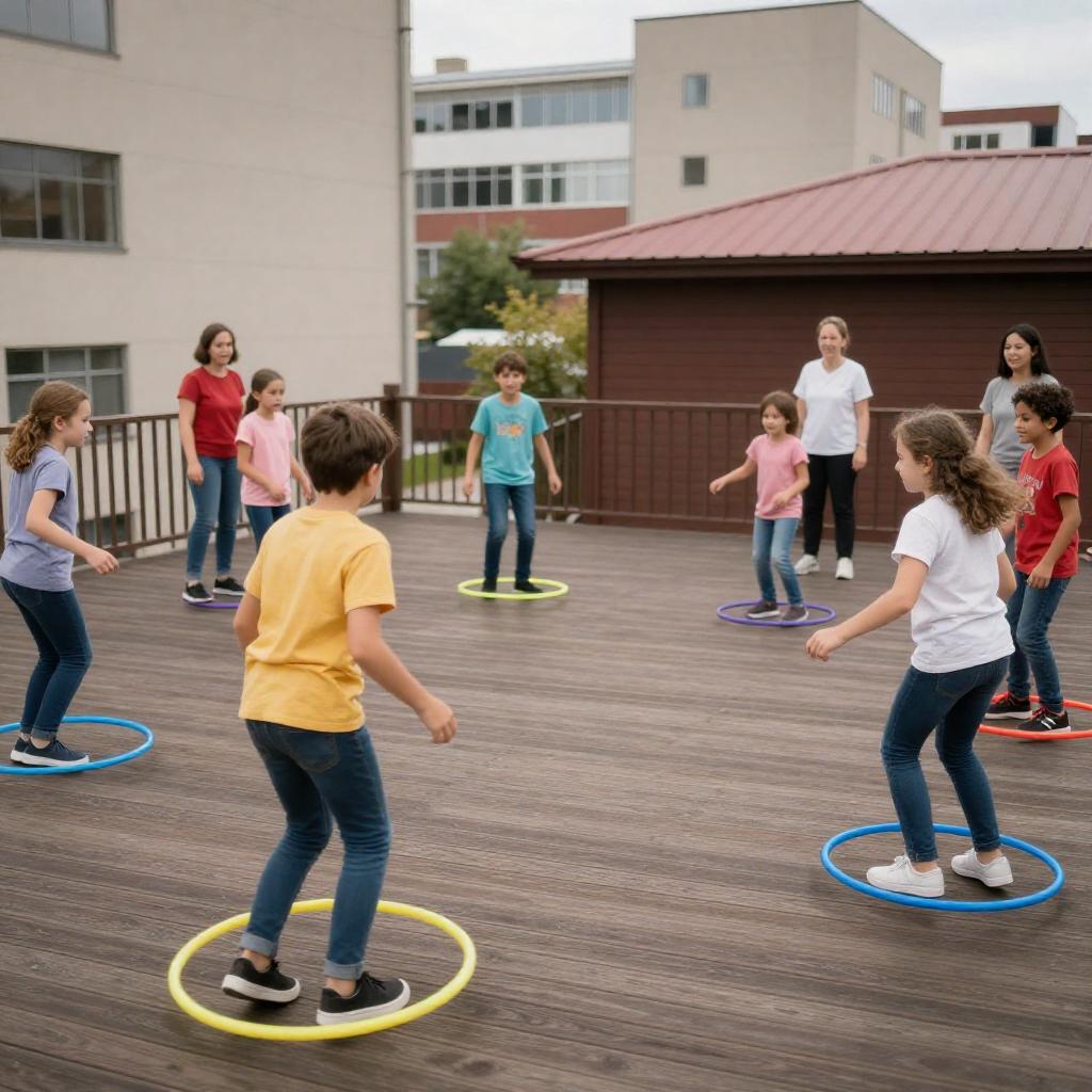 Photograph of a diverse group of children and adults hula-hooping on a wooden deck. Children in colorful shirts and jeans spin yellow and blue hoops, while adults in casual clothes watch and participate. Urban background with buildings and a red-roofed structure. Bright, lively atmosphere with dynamic movement.