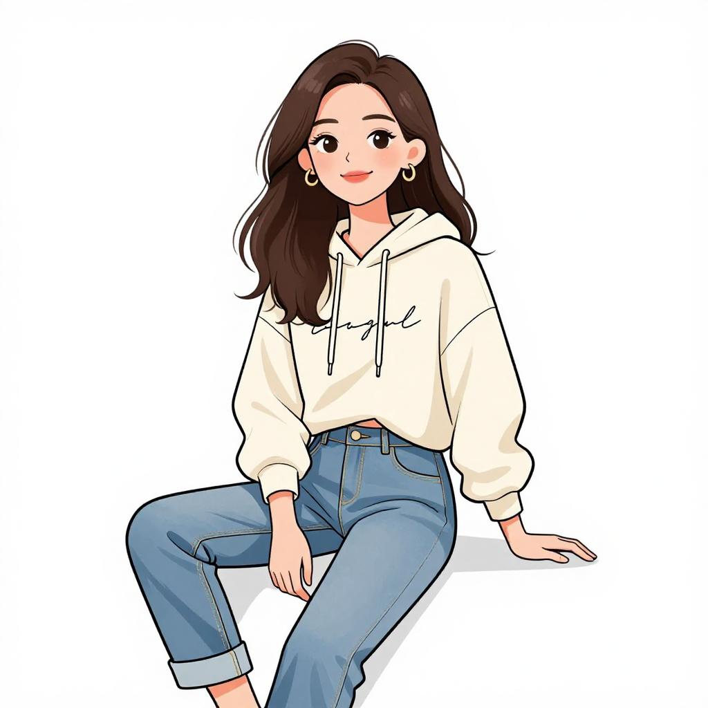 This digital drawing depicts a young woman with long, dark brown hair and fair skin, sitting casually. She wears a white, loose-fitting hoodie with drawstrings and high-waisted, blue jeans with slightly rolled-up cuffs. Her left hand rests on her lap while her right hand supports her seated position. She has a slight smile and is blushing, with large, dark eyes and minimal makeup. She also wears small, round earrings. The background is plain white, making the character the focal point. The style is clean and vibrant, with bold outlines and a slightly cartoonish, anime-like aesthetic.