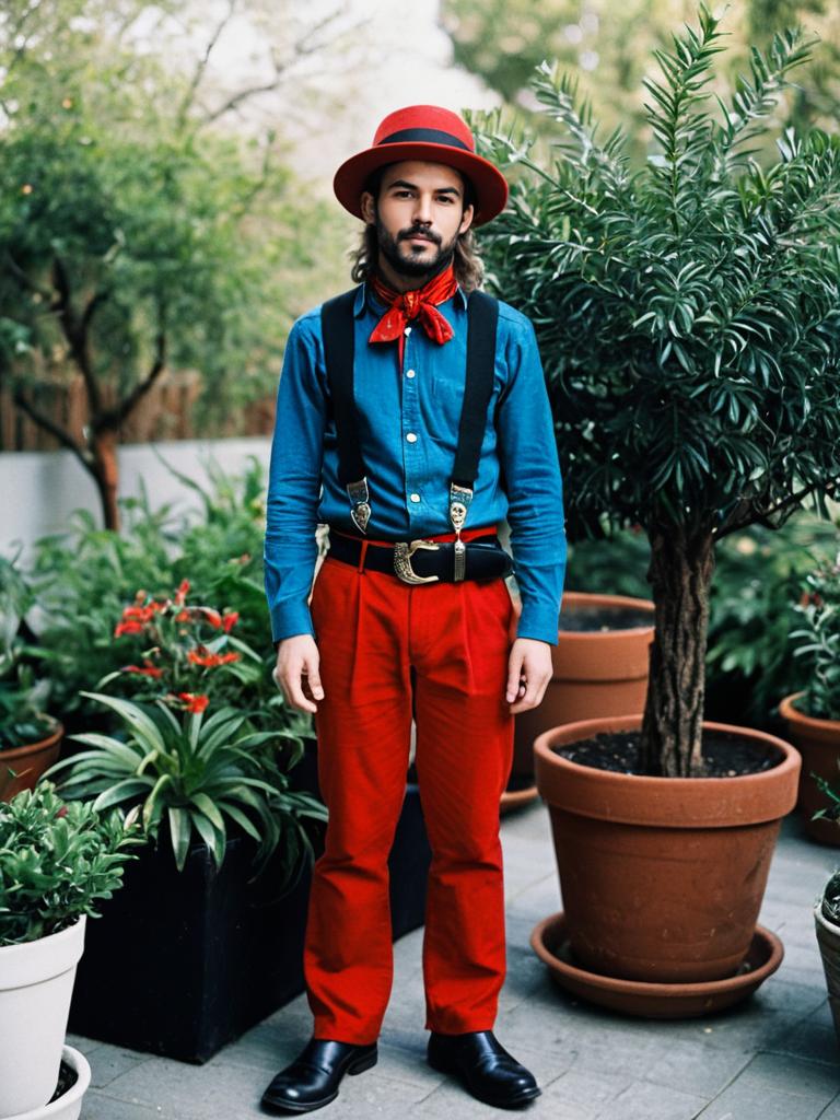 A full-body portrait of a young man standing outdoors surrounded by potted plants. He is wearing a red hat, red pants, black suspenders, a blue long-sleeve button-up shirt, and black shoes. The man has facial hair and long hair, accessorized with a red neckerchief and a black belt with a decorative buckle. The background is blurred, highlighting the subject among greenery and trees in pots.