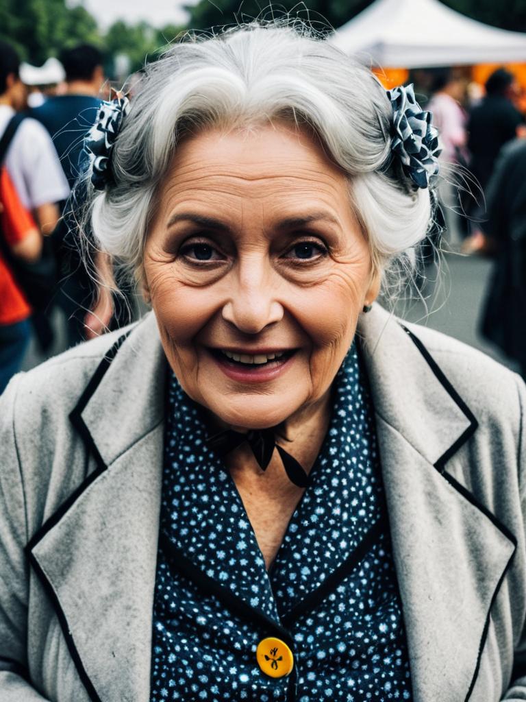 Close-up portrait of an elderly woman with gray curled hair wearing a vibrant blue costume, colorful beaded necklace, and round glasses. She is outdoors at a cosplay festival or event.