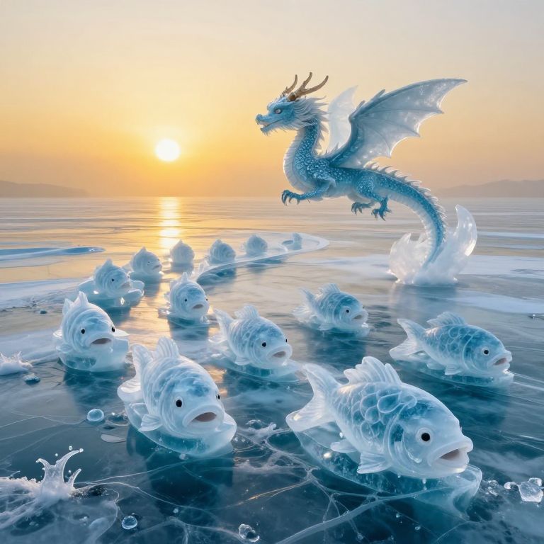 A mythical dragon glides serenely through a surreal seascape where the ocean has frozen mid-wave, leaving behind a trail of perfectly preserved, smiling fish encased in icy blocks that float like ethereal sculptures beneath the golden glow of a setting sun.