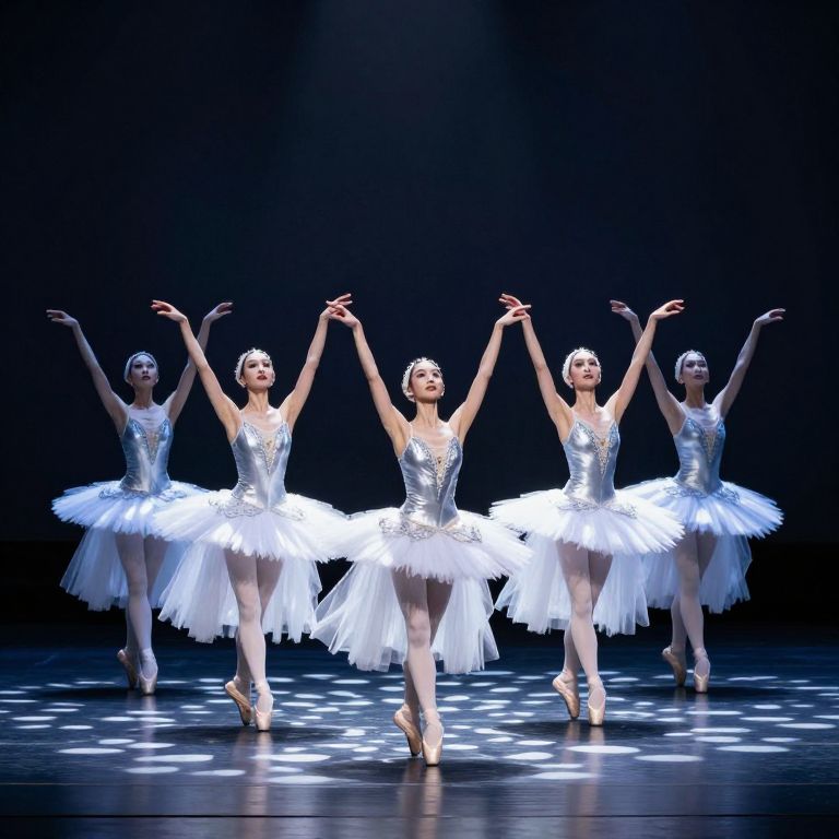 Five ballerinas in shimmering silver bodices and flowing white tutus gracefully extend their arms above their heads, performing synchronized movements on a dark stage illuminated by scattered circular lights that reflect like sound waves, creating a mesmerizing interplay of light and shadow.