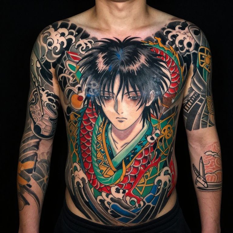 A detailed, colorful full-body tattoo on a muscular male chest and arms. The tattoo features a melancholic, anime-style face with black, messy hair in the center, surrounded by intricate dragon scales, waves, and traditional Japanese patterns. The dragon's red and blue scales contrast with the green and gold geometric designs. The background is solid black, making the vibrant colors pop.