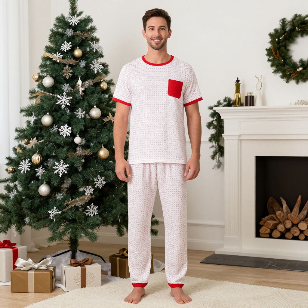 Short Sleeve Matching Christmas Pajamas Costume, man in pajamas standing in front of a christmas tree