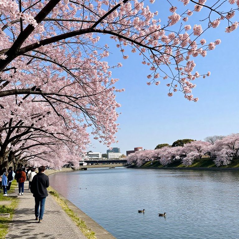 Blossoming cherry trees frame a serene waterfront scene at Chidorigafuchi, Tokyo, with vibrant pink petals cascading over dark branches against a clear blue sky, while people gather along the path below and ducks float peacefully on the calm water.