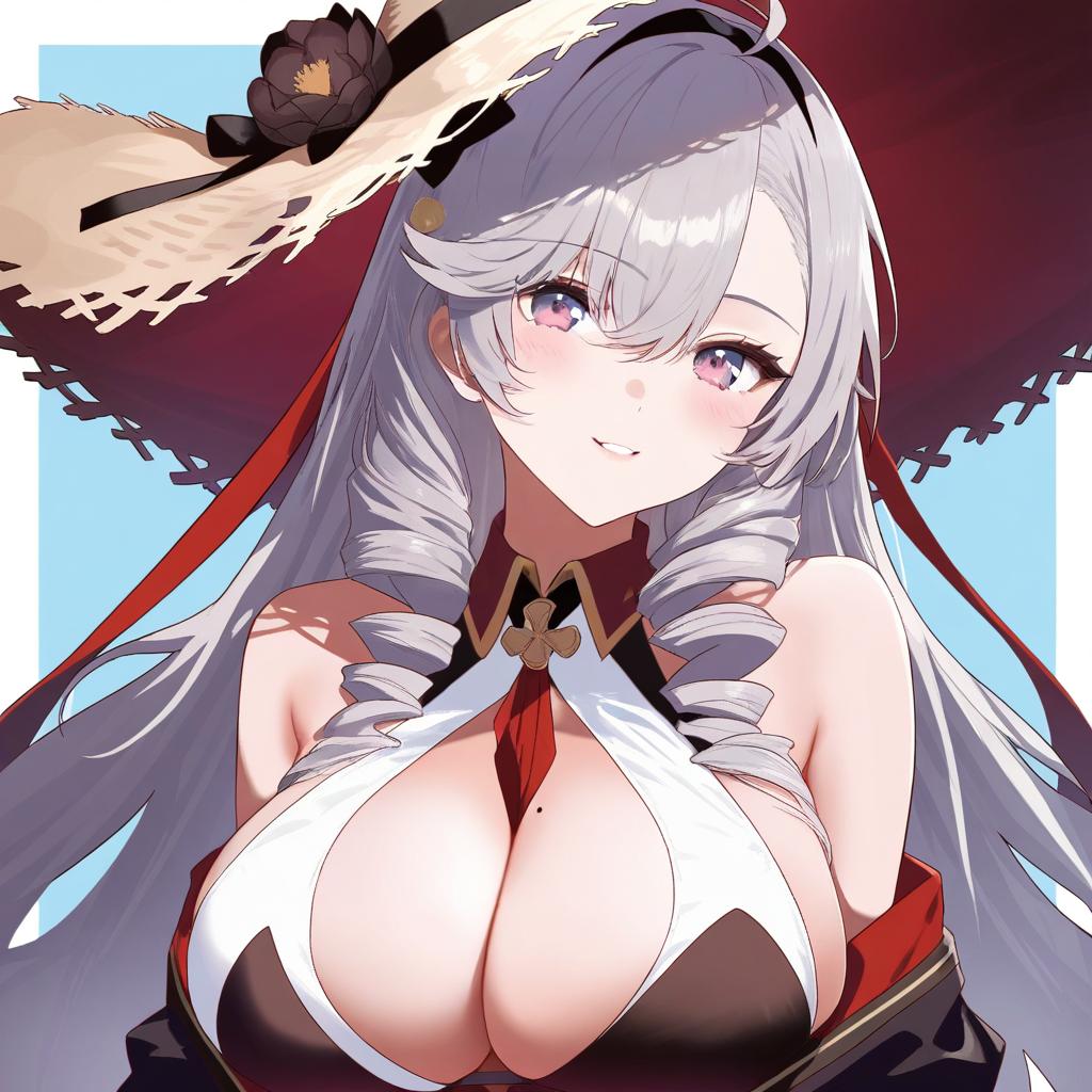 Algerie (azur lane), azur lane, 1girl, purple eyes, hair between eyes, mole under eye, grey hair, long hair, very long hair, white hair, large breasts, mole on breast, cleavage, white bikini, two-tone bikini, straw hat, hat flower, bare shoulders, twin drills, drill sidelocks, by artist konnyaku (kk-monmon), animagine