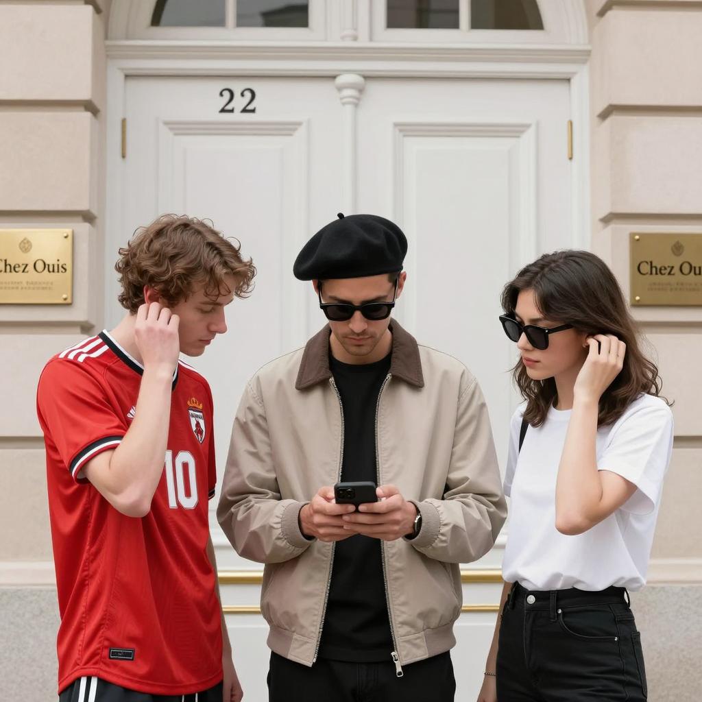 Three people standing in front of a white door with gold trim and number 22. The man in the center wears a black beret, sunglasses, and a beige jacket, adjusting his phone. The man on the left wears a red soccer jersey with white numbers, adjusting his ear. The woman on the right wears black sunglasses and a white top, adjusting her hair. Gold "Chez Ouis" plaques on either side of the door. All three have short to medium brown hair.