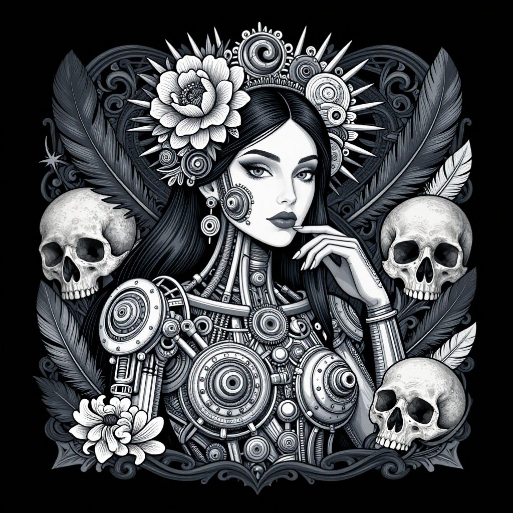 Black-and-white digital drawing of a woman with intricate mechanical armor, surrounded by skulls, feathers, flowers, and clockwork gears.