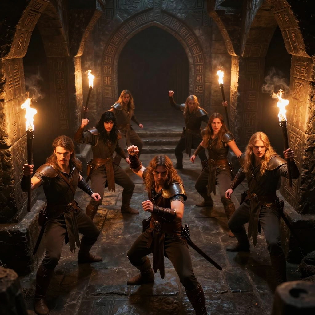 Photograph of seven muscular, long-haired warriors in black leather armor, fighting stances, in a dimly lit, brick-walled corridor with flaming